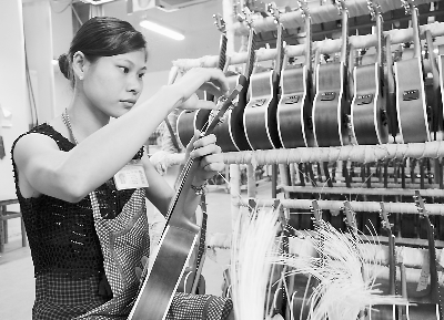 台企钰丰乐器有限公司员工正为准备出口的高端吉他安装琴弦。